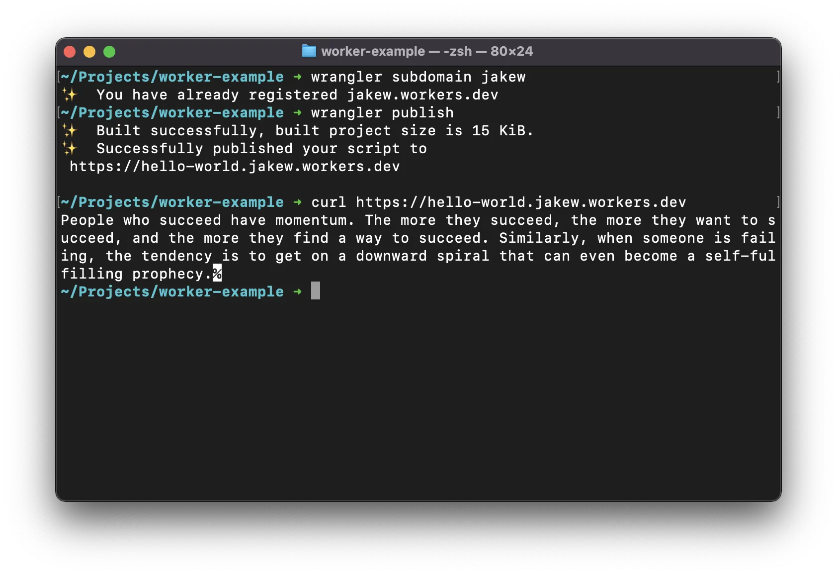 You will then be given the URL of your published Worker! Notice the start of the domain is the name value in your wrangler.toml which in this case is hello-world.